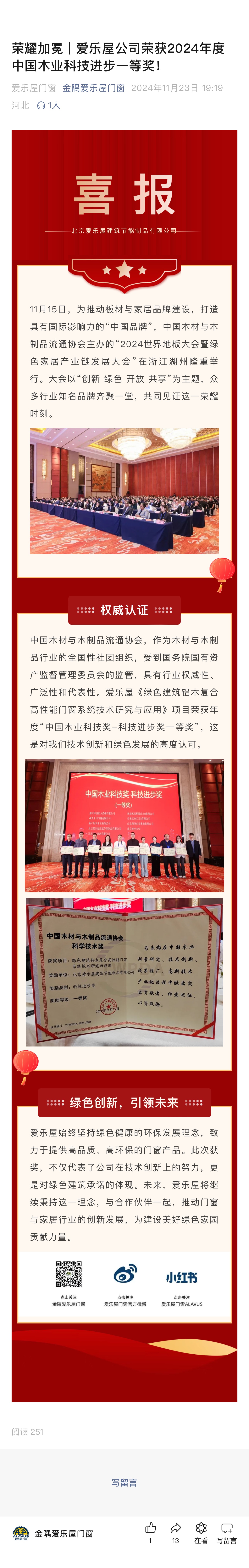 榮耀加冕 | 愛樂屋公司榮獲2024年度中國(guó)木業(yè)科技進(jìn)步一等獎(jiǎng)!